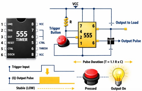 Zirkuitu monoegonkor batean 555 Timer IC erabiliz, tenporizazio-formulak irteerako pultsuak GOAN mantentzen duen zehazten du abiarazte baten ondoren.Pultsu-zabalera hau ren araberakoa da erresistentzia (R) eta kondentsadorea (C) zirkuitura konektatutat.Harremana hau da: